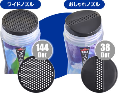 マジックパウダーはツインキャップ・ツーウェイノズルシステムを取り入れています。上部ノズルには144箇所の吐き出し口を持ち、広範囲用として使用できます。下部ノズルは中央を起伏させ、38箇所の吐き出し口を設け、髪の分け目やカラーのリタッチ等にピンポイント使用を簡単にできるように設計されています。マジックパウダーの吐き出し口は、当社使用パウダーに合わせ、その口数・口径変更やテーパー変更・蓋の肉厚等、数多くの試作品を製作し、均等で上品なパウダーの吐き出しを探し出しました。マジックパウダー開発に最も時間が掛かったのは、パウダーの吐き出し口です。この結果、均等で上品なパウダーの吐き出し口を実現できました。副産物として、従来商品のようにボトルをひっくり返して使用する際に生じる、1回目の吐き出し量が多いという欠点も解消しました。