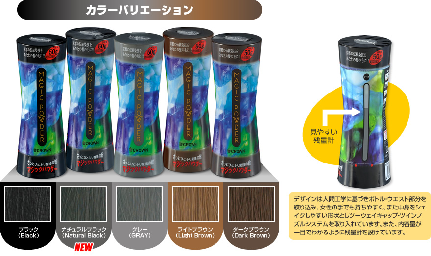 マジックパウダーは特殊加工された静電気を帯びた高温処理済みの植物性繊維(0.5mmに裁断した繊維)で、微細なパウダーになっており、ふりかけると静電気で髪や頭皮に付着し、気になる薄毛部分を自然にカバー出来たり、カラーのリタッチが簡単に手早く出来る商品です。黒髪の上から軽く違うカラーのマジックパウダー(ライトブラウン等)を振り掛けることで、簡単にイメージチェンジも可能です。高温処理済繊維を使用していますので、より衛生的に使用することができ、髪や地肌に害は無く、養毛剤との併用も出来ます。