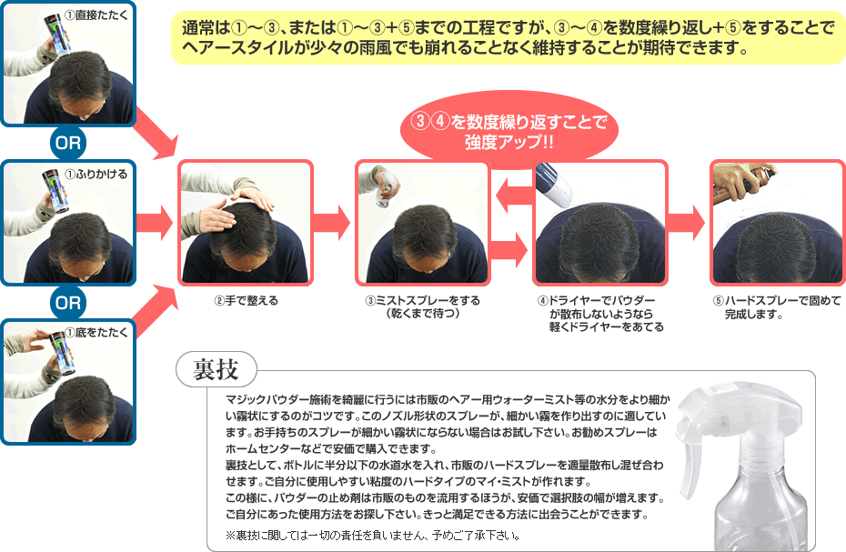 マジックパウダー仕上がりまでの工程(振りかけ方法は3種類です)
