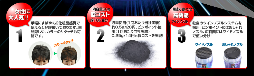 安心のメーカー直売。マジックパウダーは安価で手軽に、メイク感覚で使える薄毛隠しアイテムです。